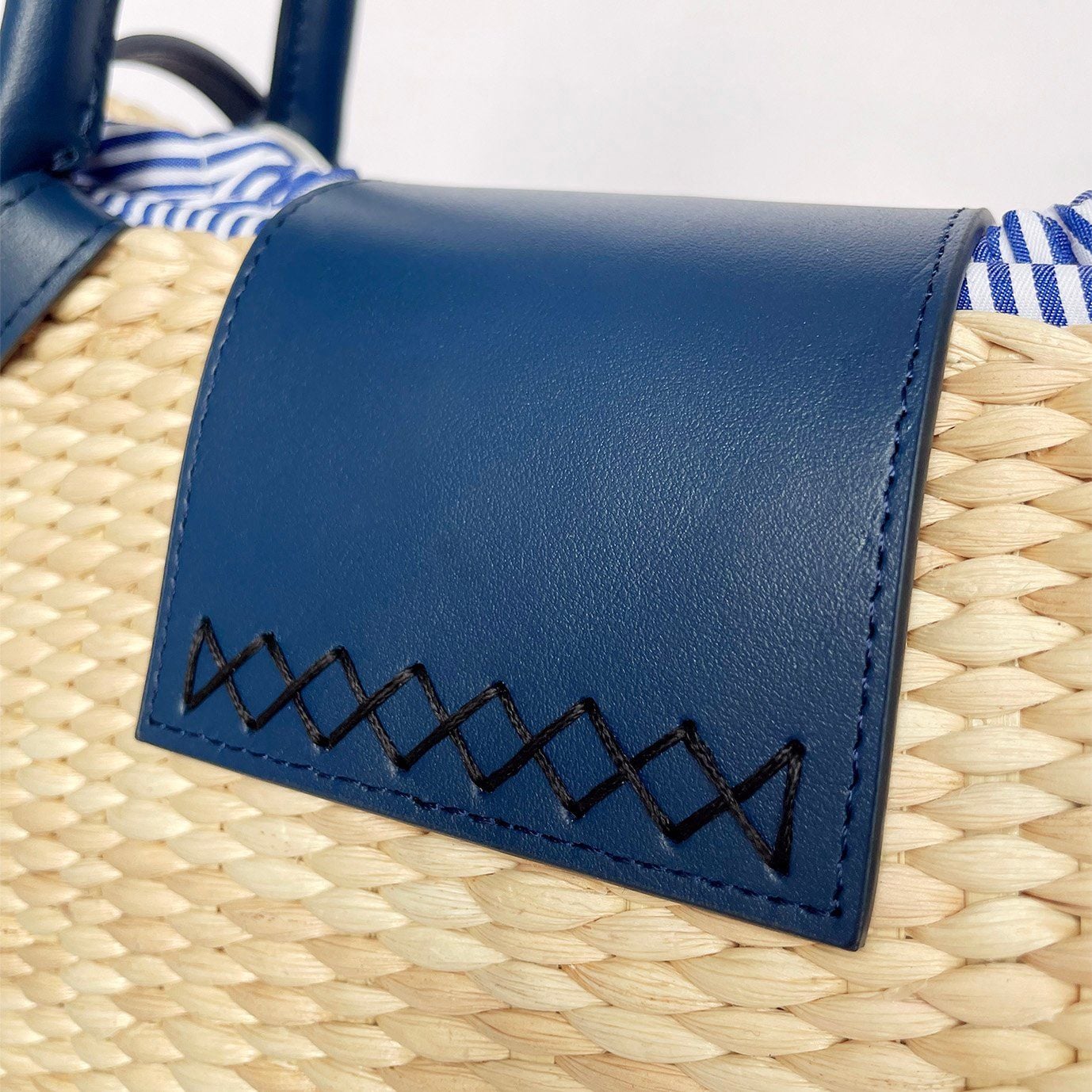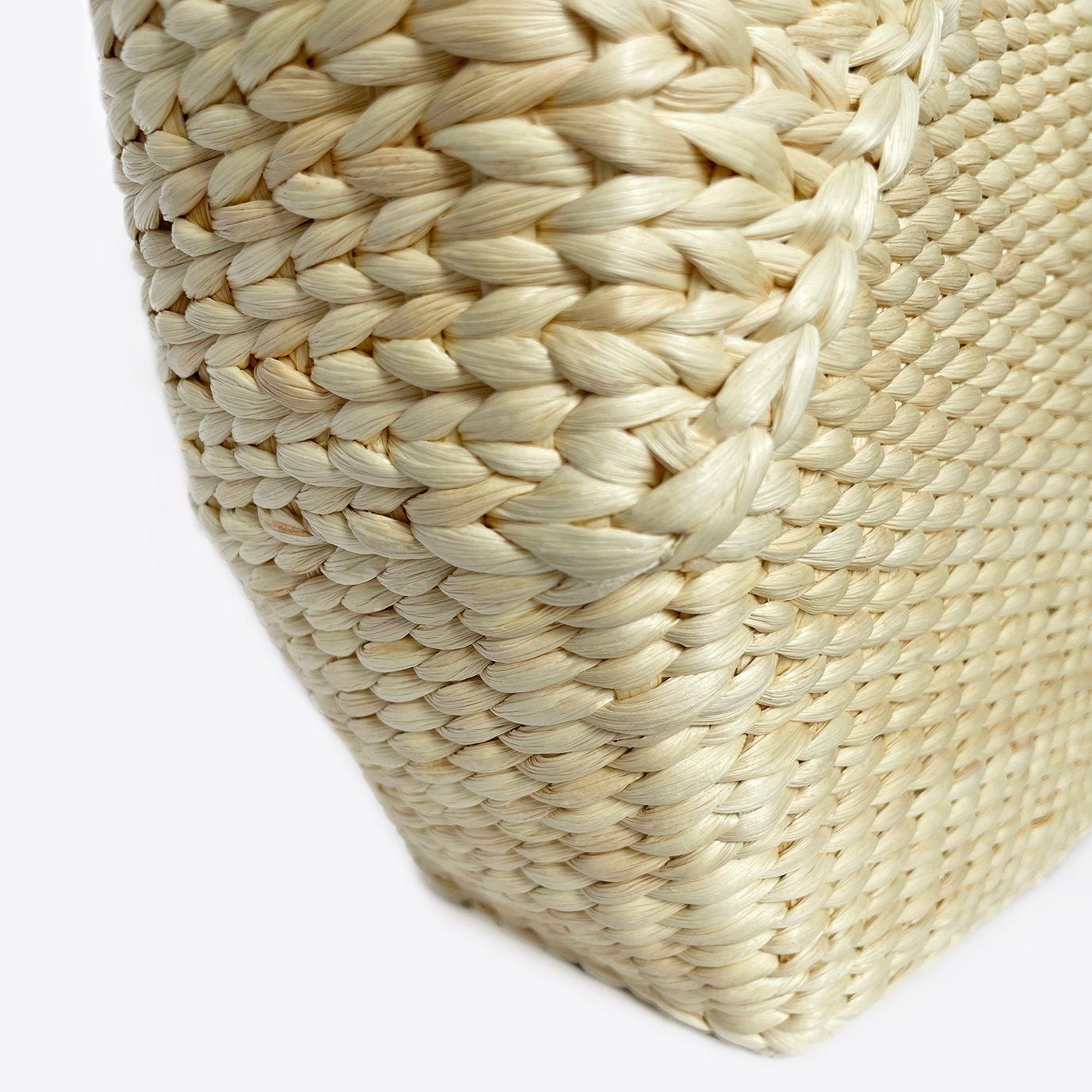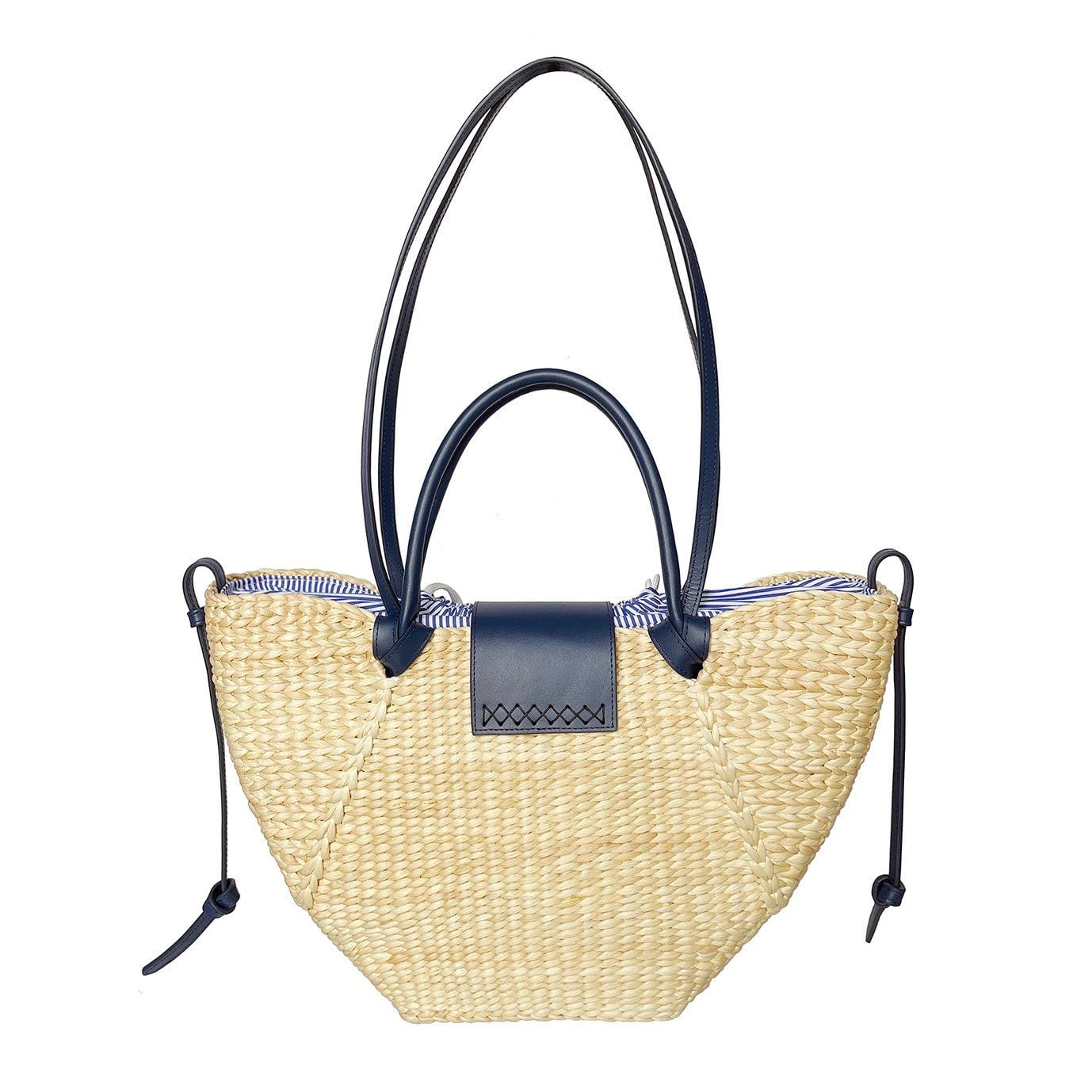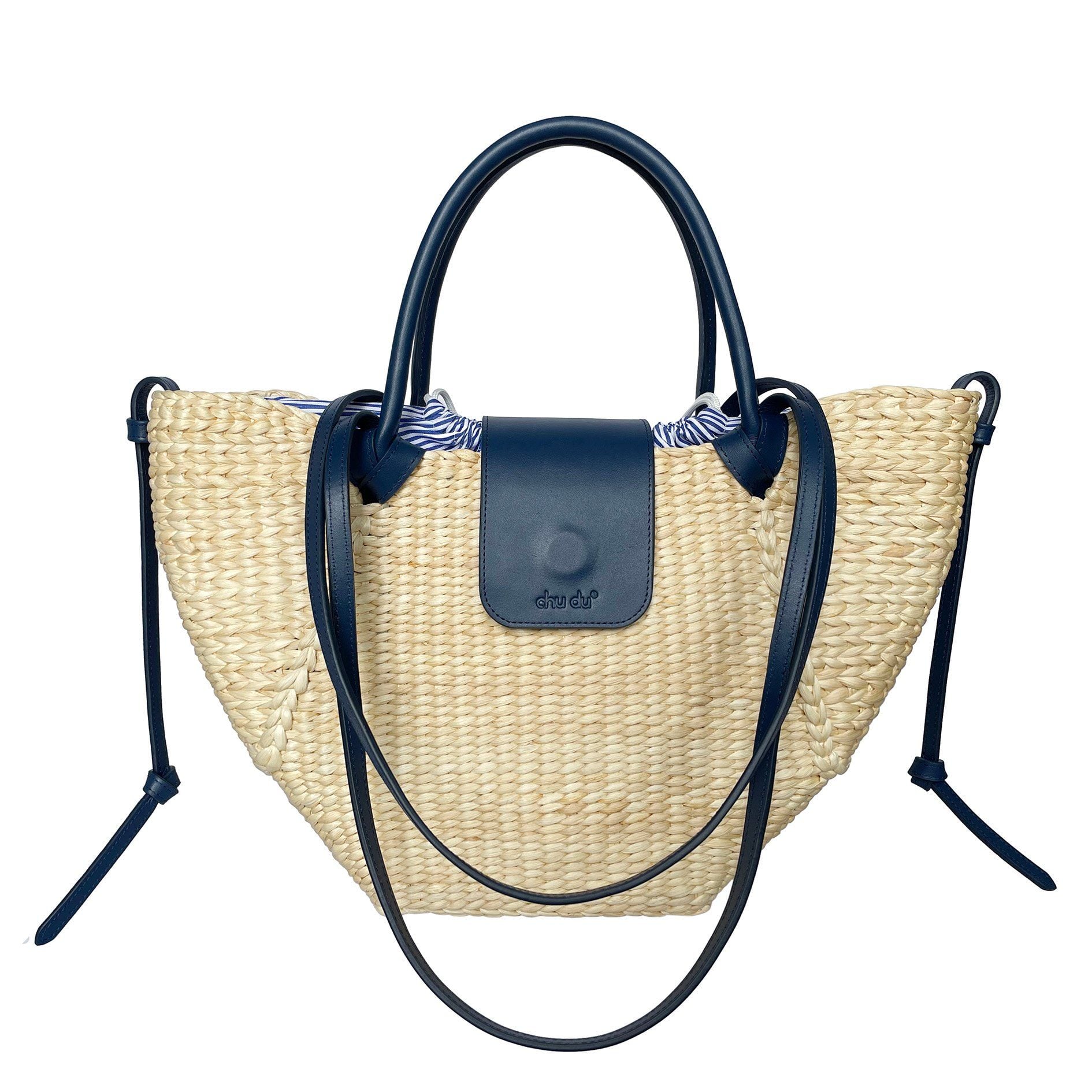 - Chất liệu: Lục bình đan tay, da bò thật, lót cotton sọc